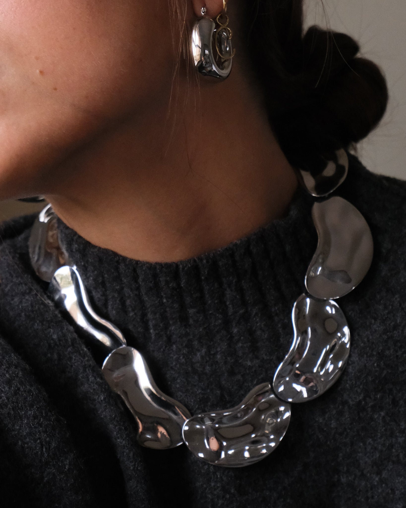 Collana girocollo realizzata da maxi placchette martellate dalla forma irregolare, disponibile in finitura oro o argento, leggerissima da indossare ma di grande impatto e super luminosa.